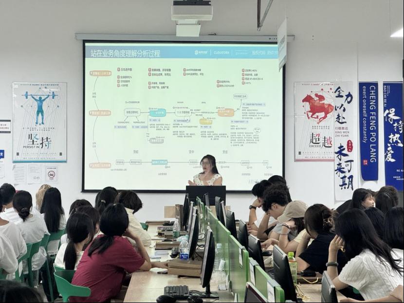 讲座最后,翰海睿智产教融合部方小婷部长详细介绍了25级移动商务专业和商务数据分析专业的学习内容及未来发展方向。她指出,移动商务专业深度融合互联网技术与市场营销策略,旨在全面提升学生的综合能力,使其在电商平台运营、推广及客户服务等领域能够脱颖而出,取得显著成就。商务数据分析专业则专注于大数据分析技术的应用,教导学生如何高效收集、精准处理、深入分析数据,并从中挖掘商业价值,为企业决策提供有力支持。方部长还通过分享多个成功案例,激励新生积极投身专业学习,勇敢追求梦想,期待他们在未来的各自领域中大放异彩。