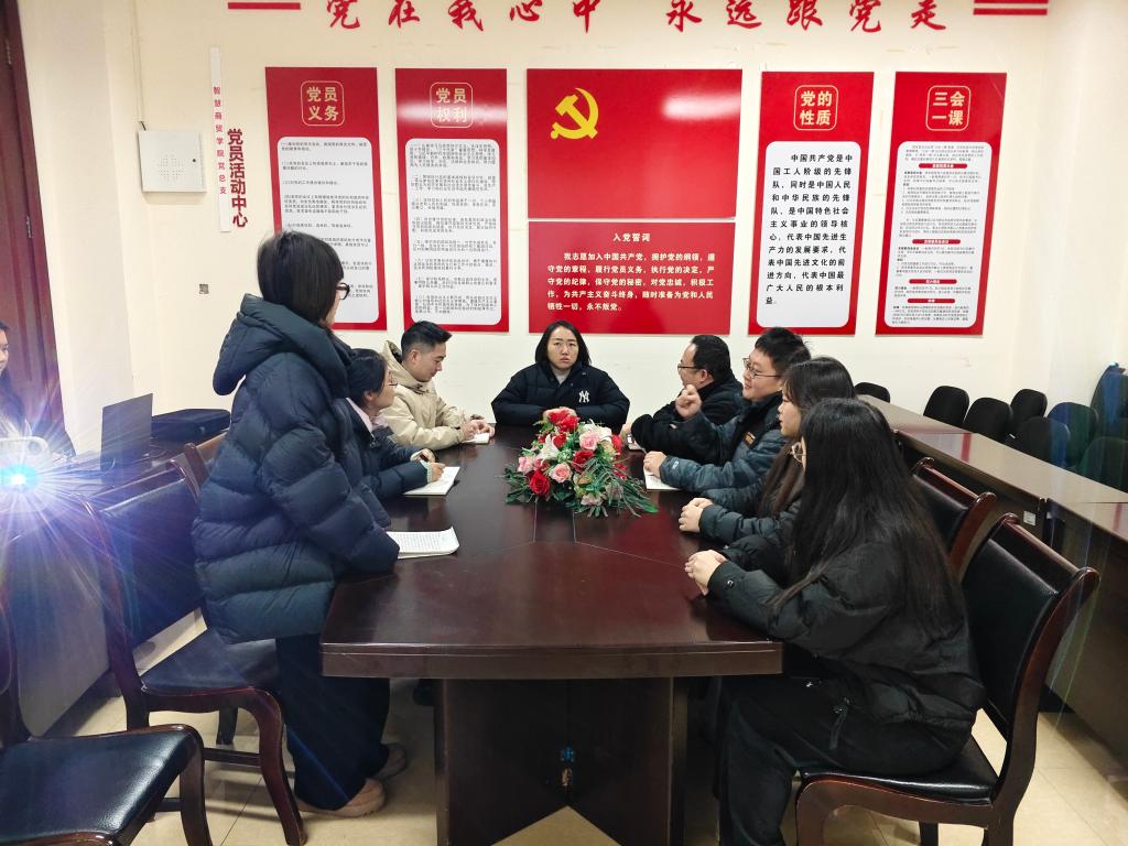 2025年12月5日,智慧商贸学院学生党支部在笃学楼3412会议室组织开展十二月主题党日活动。本次活动紧扣时代脉搏,聚焦发展前沿,通过系统学习党的创新理论、关于发展新质生产力的重要论述、党的自我革命战略思想以及习近平法治思想的最新成果,引导支部全体党员深刻把握国家发展大势,筑牢思想根基,强化责任担当。活动由党支部书记主持,全体学生党员参加。