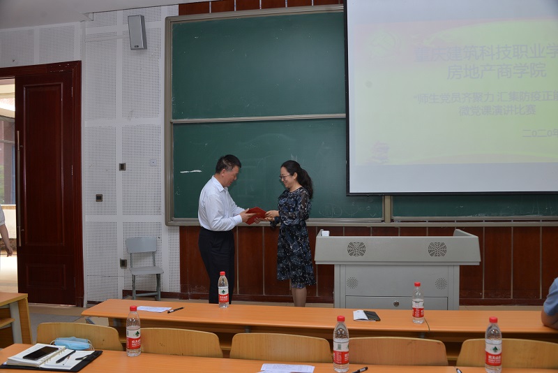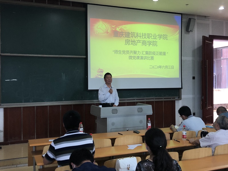 为深化“不忘初心 牢记使命”主题教育,强化习近平新时代中国特色社会主义思想和党的十九大精神的学习,在广大师生中传递防疫抗疫正能量,6月3日下午1点30分,房地产商学院党总支以“师生党员齐聚力,汇集防疫正能量”为主题在笃学楼2305进行首届“微党课”演讲比赛决赛。校党委陈锦连副书记、党委组织部康刚部长、学生处冉小平处长、督导室张德新主任、党委宣传部高云部长、商学院周正辉院长以及商学院全体师生党员、预备党员及入党积极分子积极200余名师生参加了此次活动。
