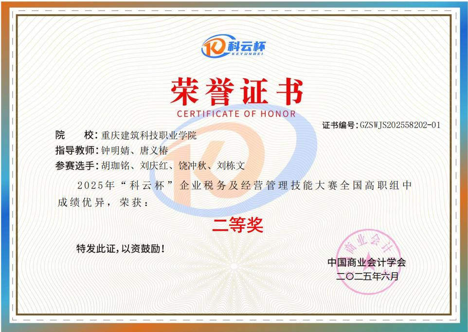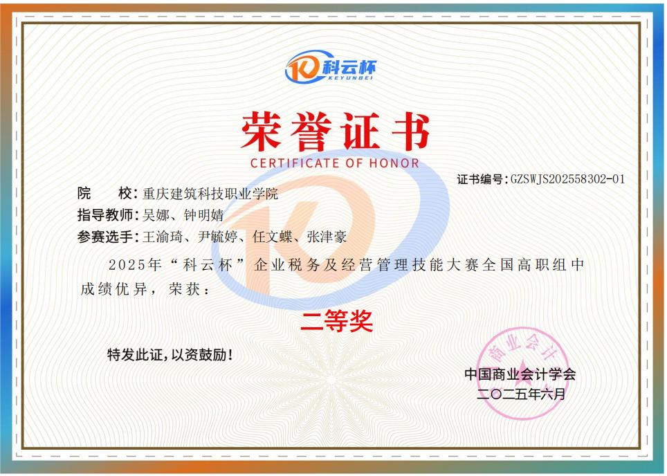 2025年5月24日,迎来了一个紧张的日子,2025年“科云杯”企业税务及经营管理技能大赛如期举行。经过一整天的激烈角逐,beat365智慧商贸学院代表队在该项比赛的全国高职组中表现出色,纷纷荣获“二等奖”。这一荣誉不仅是对参赛选手辛勤付出的认可,也是对他们平时辛苦训练成果的肯定。