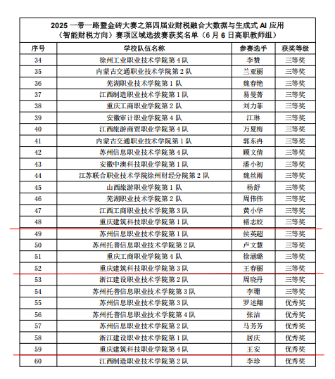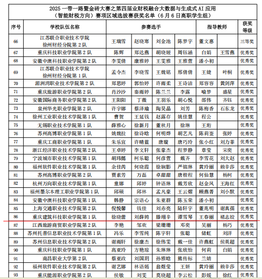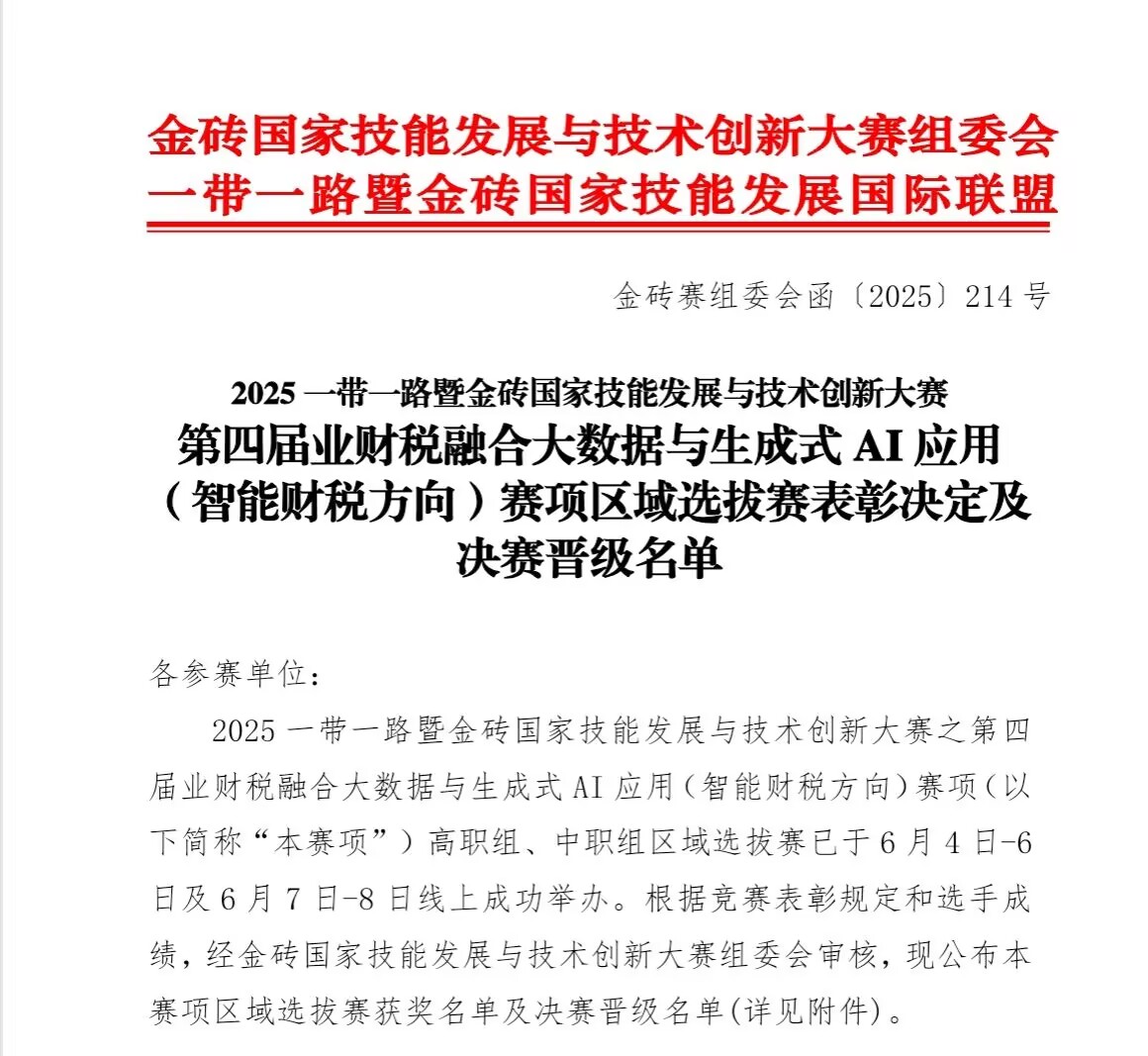 近日,2025年一带一路暨金砖国家技能发展与技术创新大赛第四届业财税融合大数据与生成式AI应用(智能财税方向)赛项区域选拔赛圆满落幕,beat365大数据与财务管理专业师生在此次大赛中表现出色,其中教师参赛荣获三等奖二项、优秀奖一项,学生参赛获优秀奖一项,褚志姣老师顺利晋级国赛。