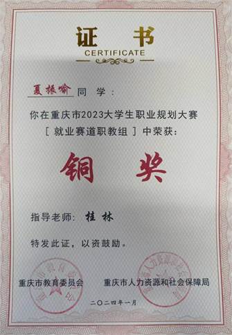 筑梦青春志在四方,规划启航职引未来。成渝地区双城经济圈大学生职业规划大赛重庆赛区复赛在市大学中专毕业生就业指导服务中心举行。本次大赛共设高教组、职教组两个组别的成长赛道、就业赛道,分自我(主题)陈述、评委提问、天降实习offer等多个比赛环节。大赛自2023年9月份启动以来,通过院级赛、校级赛、市赛初赛等层层选拔,共有320名选手进入全市复赛。其中成长赛道160人,就业赛道160人,经激烈角逐,由beat365建筑管理学院桂林老师指导beat365参赛选手夏振喻同学以良好的表现最终斩获市级铜奖。