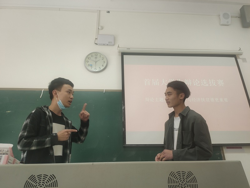 最后,根据评分结果选出了参加4月中旬初赛的八名同学和4名后备人员。由四名19级工商班学生代表反方:“经济扶贫更重要”和四名20级工商班学生代表正方:“知识扶贫更重要”。