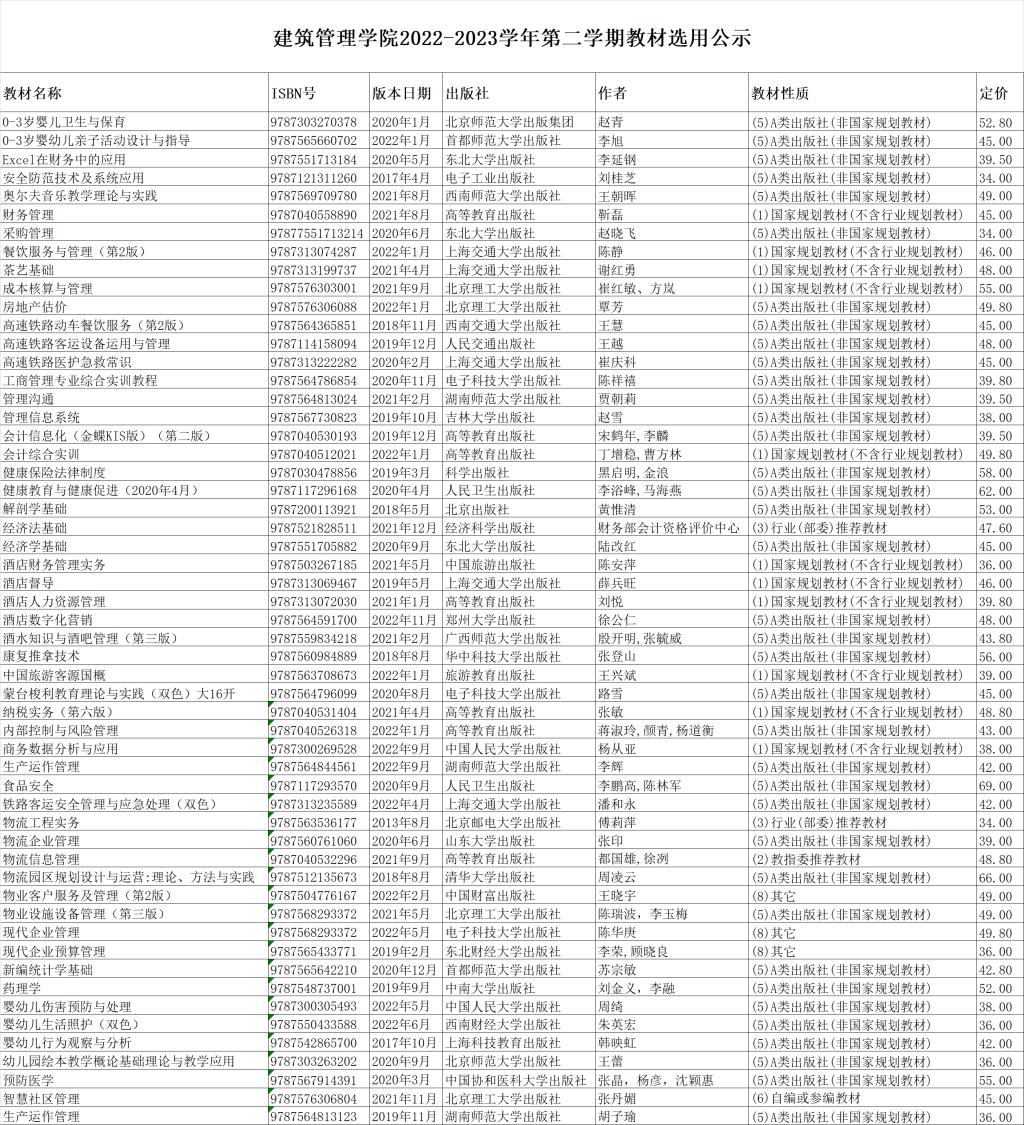 建筑管理学院2022-2023学年第二学期教材选用公示