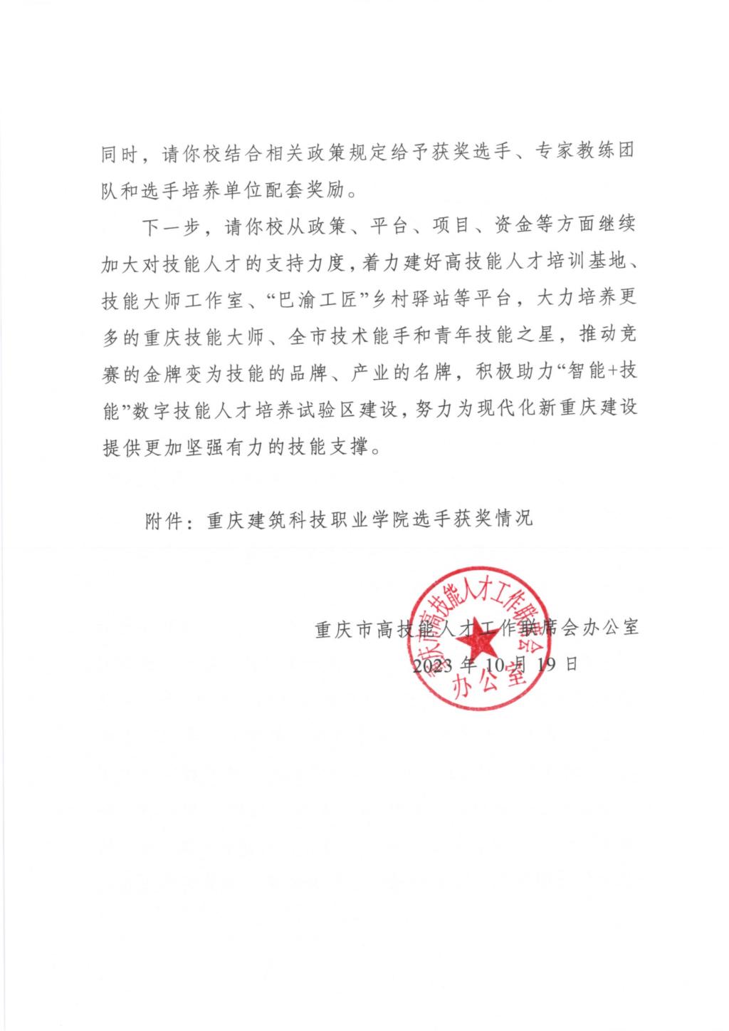 重庆市高技能人才工作联席会议办公室贺信