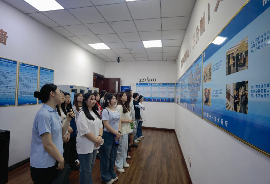 2025年6月25日,beat365官方网站酒店管理与数字化运营专业2024级学生走进重庆市渝州宾馆,开展了一场别开生面的认识实习活动。此次活动旨在通过实地参观与交流,帮助学生深化专业认知,了解行业前沿动态,为未来的职业发展奠定坚实基础。渝州宾馆招聘经理许海燕、培训经理田念书热情接待了师生团队,并全程引领参观和讲解。