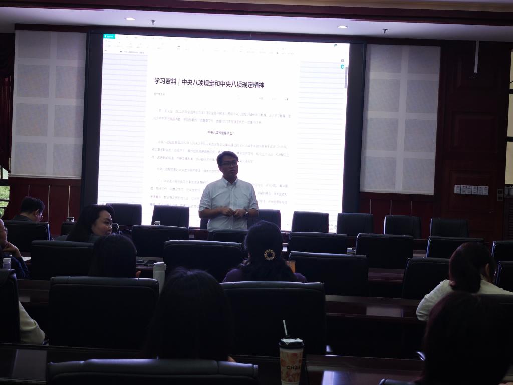 会上,殷源同志介绍了中央八项规定的具体内容,从改进调查研究、精简会议活动等八个方面详细阐述,强调其对党员干部作风建设的重要意义。同时,解读中央八项规定精神,指出核心在于反对“四风”,实质是倡导勤俭节约、廉洁从政等。她结合学院工作实际,提出教师党员在教学、科研、服务学生中要严格落实中央八项规定精神,杜绝形式主义,真抓实干提升教育教学质量。