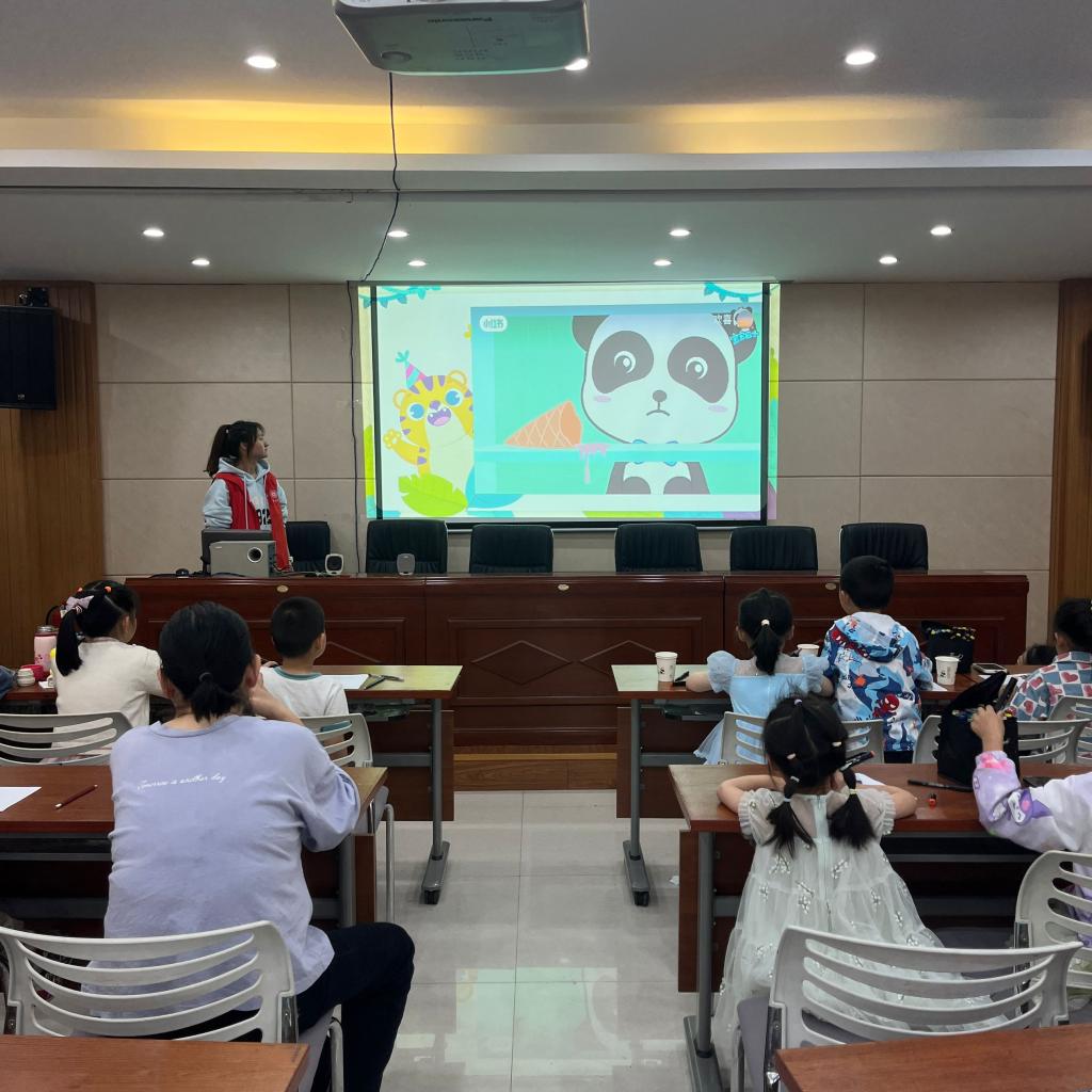 活动进行中,志愿者们带领小朋友们进行了冰淇淋绘画创作。为孩子们介绍冰淇淋的起源、种类与造型特点,通过视频展示多幅主题绘画作品,给孩子们启发和创作思路,随后为小朋友们分发水彩、蜡笔等绘画工具,自由创作心中的冰淇淋世界,并耐心地指导孩子们绘画。