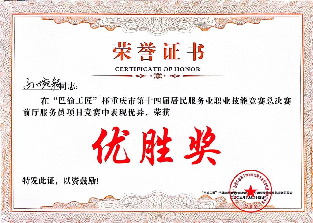 近日,由重庆市商务委员会、重庆市人力资源和社会保障局、重庆市总工会、共青团重庆市委、重庆市妇女联合会五部门联合主办的“巴渝工匠”杯重庆市第十四届居民服务业技能竞赛总决赛隆重举行并圆满落幕。智慧康养学院师生代表队在此次高水平技能盛会中奋勇争先,表现卓越,在多个赛项中连创佳绩,最终斩获一等奖1项、三等奖1项、优胜奖6项的辉煌战果,并获得相应的职业技能等级证书。其中,罗钲杰同学获得高级调饮师证书;吴俐霓老师、孙婉颖老师以及学生罗钲杰获得高级前厅服务员证书;周琦琦、刘蹬帮、陈羽佳三位同学获得中级保洁员证书。本次竞赛成绩充分展现了学院师生精湛的专业技能和昂扬的精神风貌,也体现了beat365在职业技能培养方面的扎实成效。