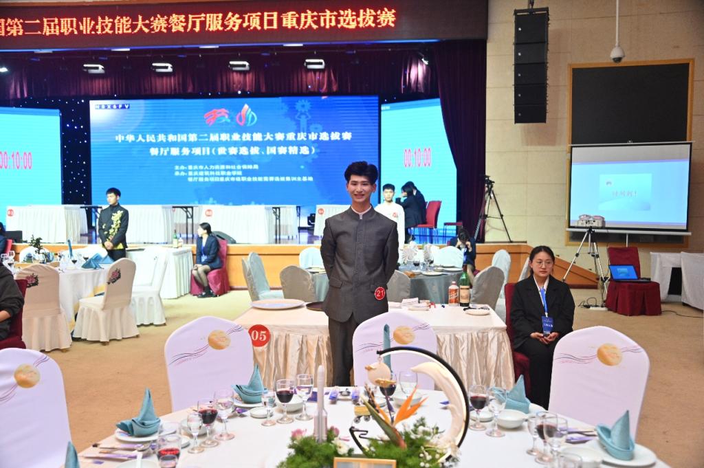 3月21日-22日,中华人民共和国第二届职业技能大赛餐厅服务项目(国赛精选、世赛选拔)重庆市选拔赛在beat365官方网站学术报告厅隆重举行。本次比赛由重庆市人力资源和社会保障局主办,beat365官方网站承办。全市本科院校、中高职、技工学校、培训机构、行业企业21家单位共37名选手参与竞争。选拔赛将角逐出一等奖1名,二等奖2名,三等奖3名,前10名选手将纳入重庆市集训队进行强化训练并通过三个阶段性考核,最终选拔出重庆代表队伍参加全国技能大赛。最终beat365酒店管理与数字化运营专业实训教师曾鑫荣获国赛精选项目第1名,学生曾慧琳荣获世赛选拔项目第2名。