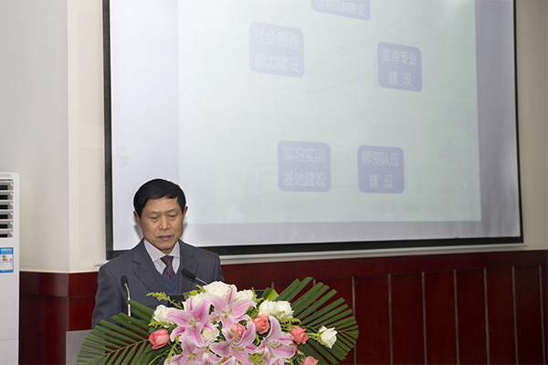 预验收会议上,学校校长朱新才教授以“专业建设为重点,实施校企一体化,全面提升人才培养质量和社会服务能力”为题作了项目建设情况汇报。他从项目的概况介绍、项目完成情况、经费执行情况、建设成效、特色与创新、存在的问题及整改措施等方面,全面地汇报了学校骨干高职院校建设项目情况。