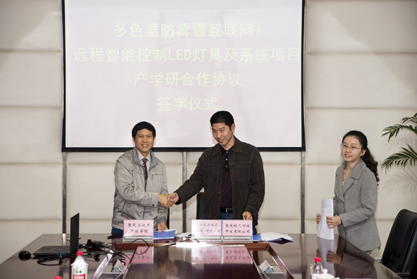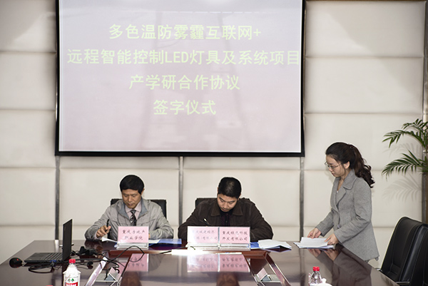 经过会议双方的友好协商,重庆城建经济(集团)有限公司、重庆绿色科技开发有限公司与重庆房地产职业学院,本着“真诚合作,讲究实效,互惠互利,共同发展”的原则,就产学研基地合作、项目开发、新技术应用等方面达成协议。在双方领导的见证下,全体参会人员的掌声中,双方签定了多色温防雾霾互联网+远程智能控制LED灯具及系统项目产学研合作协议。