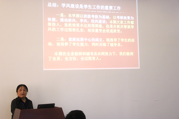 会上,各系党总支(支部)书记重点围绕本系学生工作亮点及特色逐一汇报了工作开展情况。院党委副书记吴绍莲到会并充分肯定了本期以来学生工作的实效与特色,再次强调了创建“一系一品”学生工作特色亮点的重要性。