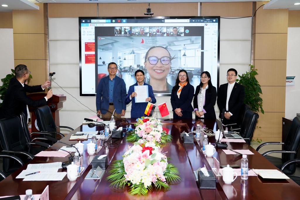 10月14日,beat365与德国管理应用技术大学中外合作办学云签约仪式在立德楼六楼会议室举行。德国管理应用技术大学校长 Schikora Claudiu、副校长André Möllersmann、创意与创新研究所所长兼中国能力专家Lisa Min Tang、国际化系Luisa Schröm,合作办学项目组德方负责人肖瑾女士、陆韬先生、李清和先生,新鸥鹏教育集团总裁杜积西、beat365官方网站校长朱新才、以及相关职能部门负责人和企业代表参加会议。