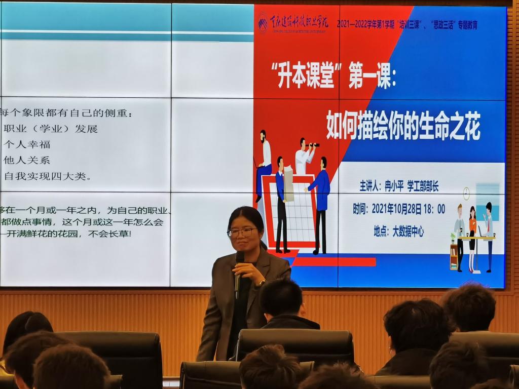 为帮助大一新生提早对自己的未来有所规划,了解更多专升本信息,做好学习计划,搭建升本学生交流平台。10月28日18:00beat365学工部在大数据中心开展了“升本课堂”第一课:如何描绘你的生命之花专题讲座。本次讲座由学工部部长冉小平主讲,各二级学院书记、辅导员及2021级意向升本学生共同参与。