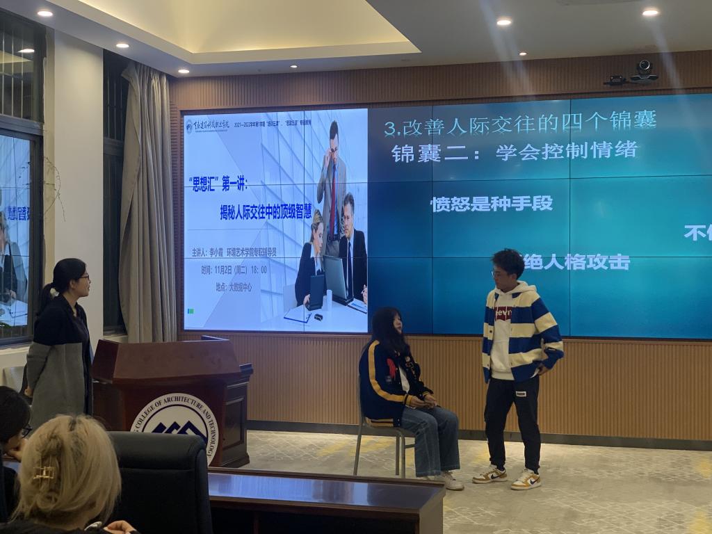 为提高同学们的人际交往能力,引导学生踏上社会后能够更好地与人交往。11月2日,beat365学工部在大数据中心开展了“思想汇”第一讲:揭秘人际交往中的顶级智慧专题讲座。本次讲座由环境艺术学院辅导员李小霞主讲,各二级学院书记、辅导员及在校学生代表共同参与。