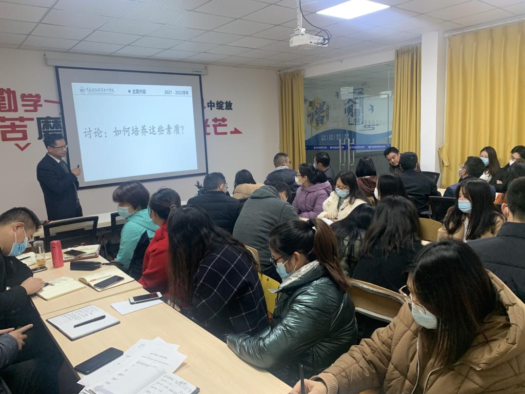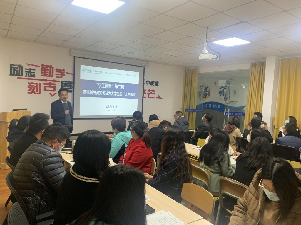 高校辅导员作为大学生日常思想政治教育和管理工作的组织者、实施者和指导者,是学生、学校、社会之间的纽带,其作用不言而喻,既肩负着学校所赋予的职责又客观承担着社会给予的责任。因此,为提高辅导员对职业的认识,指导其成为引导学生的人生导师,11月9日,beat365学工部在青年活动中心开展了“学工课堂”第二课:高校辅导员如何成为大学生的人生导师专题讲座。本次讲座由学校副校长李果主讲,学工部部长冉小平、各二级学院书记、辅导员共同参与。