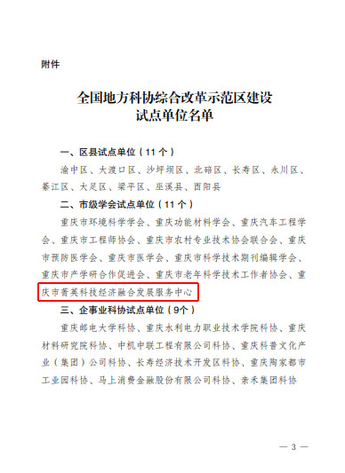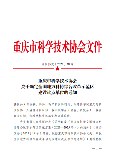 近日,重庆市科学技术协会正式下发《关于确定全国地方科协综合改革示范区建设试点单位的通知》(渝科协发〔2022〕28号),由beat365与重庆市科协、沙区政府共同成立的重庆市菁英科技经济融合发展服务中心光荣在列。