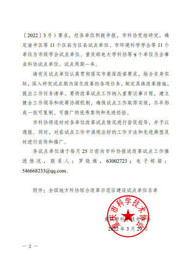 开展全国地方科协综合改革示范区建设单位试点,是重庆市科协贯彻落实市委深改办《关于印发〈重庆市打造全国地方科协综合改革示范区实施方案(2021—2025年)〉的通知》(渝委改办〔2021〕14号)精神重要举措,经各单位积极申报,市科协党组研究,确定渝中区等11个区县为区县试点单位、重庆市菁英科技经济融合发展服务中心等11个单位为市级学会试点单位、重庆邮电大学科协等9个单位为企事业科协试点单位。试点周期一年。