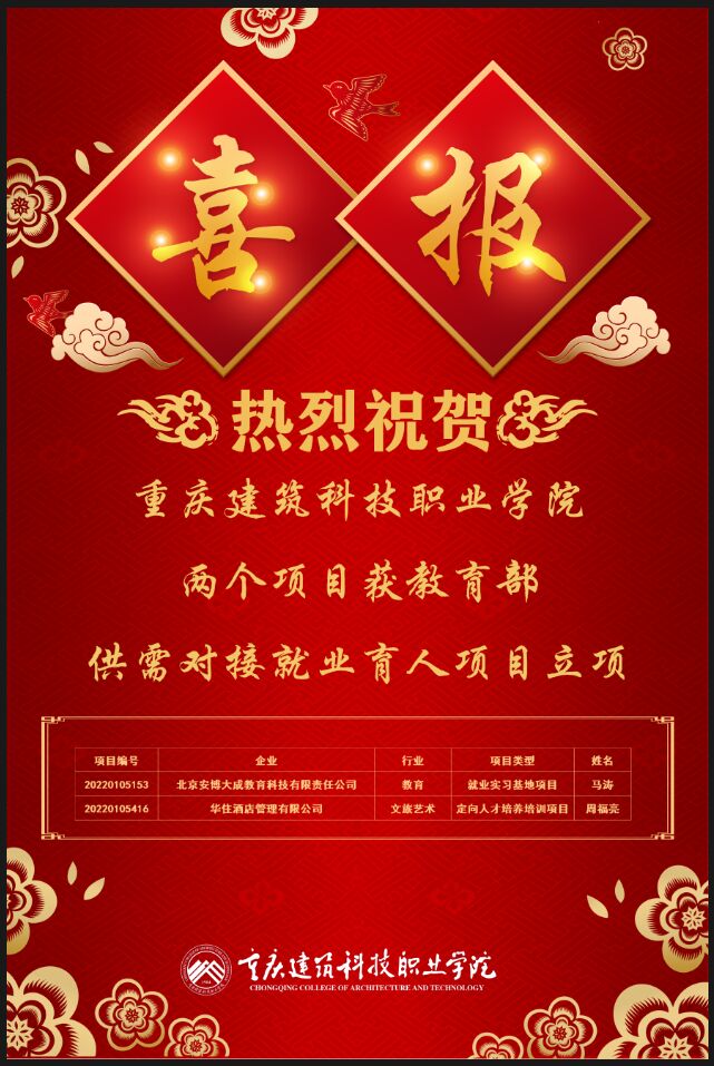 近日,教育部公布第一期供需对接就业育人项目立项名单,beat365招生就业处与北京安博大成教育科技有限责任公司、建筑管理学院与华住酒店管理有限公司联合申报供需对接就业育人项目获批立项。