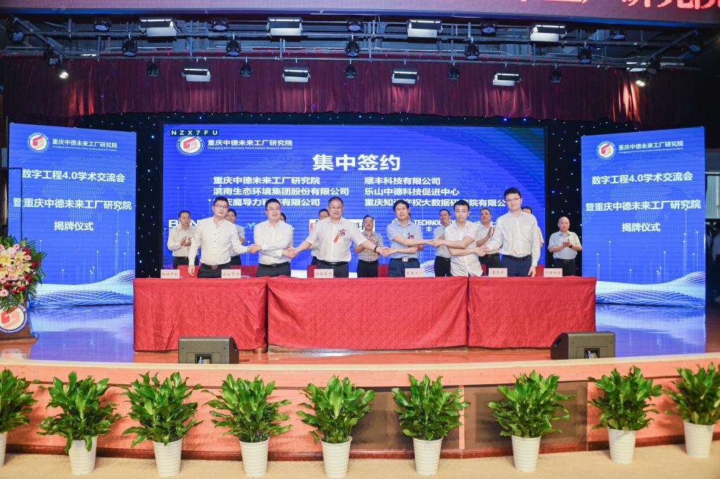 仪式上,重庆中德未来工厂研究院与合作单位代表滨南生态环境集团股份有限公司、重庆魔导力科技有限公司、顺丰科技有限公司、乐山中德科技促进中心、重庆知识产权大数据研究院有限公司集中进行了签约。