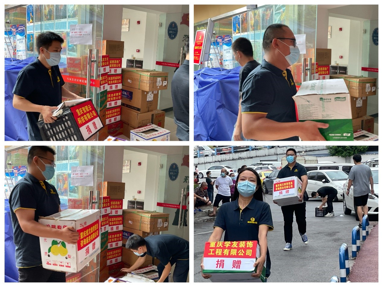 一箱箱抗疫物资,一份份企业爱心,捐赠的矿泉水、藿香正气液、方便面、水果、N95口罩、医用手套等都是社区一线抗疫工作者急需的物资,为基层疫情防控工作送来了“及时雨”。马家岩社区党委副书记苏欢感谢菁英科服中心和爱心企业以实际行动传递正能量,践行企业社会责任和企业担当的大爱之举。她表示,将对本次捐助的抗疫物资物尽其用,将企业的爱心传递给每一名一线抗疫人员。也将以更加饱满的热情、昂扬的斗志、务实的作风投入到疫情防控的战斗中,以实际行动回报社会各界的关心关爱,全面打赢沙坪坝区疫情防控攻坚战。