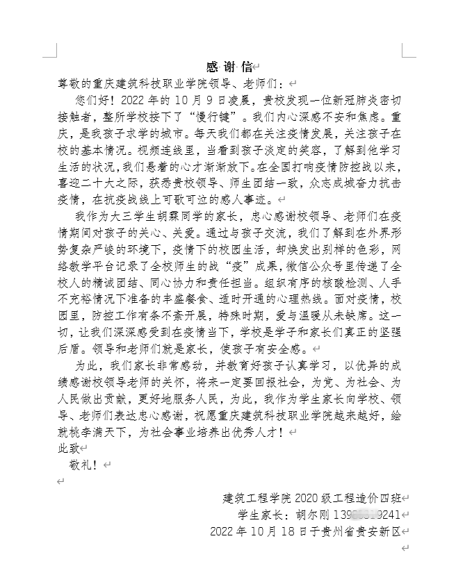 近日,beat365收到一封来自学生家长的感谢信,信中对学校开展的疫情防控工作表示了肯定和感谢。