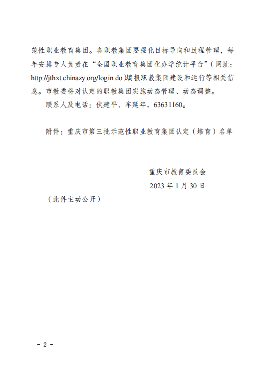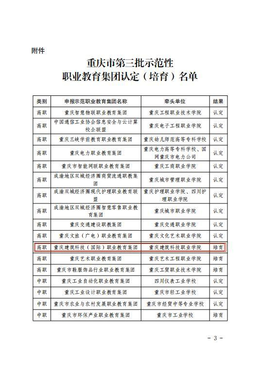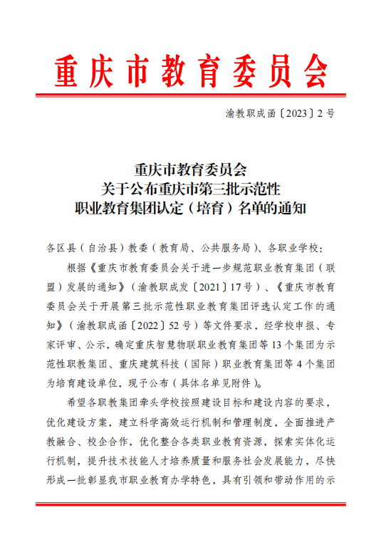 近日,重庆市教育委员会公布了重庆市第三批示范性职业教育集团认定(培育)名单,由beat365、重庆交通大学等单位共同发起组建的“重庆建筑科技(国际)职业教育集团”被认定为“重庆市第三批示范性职业教育集团(培育)”。