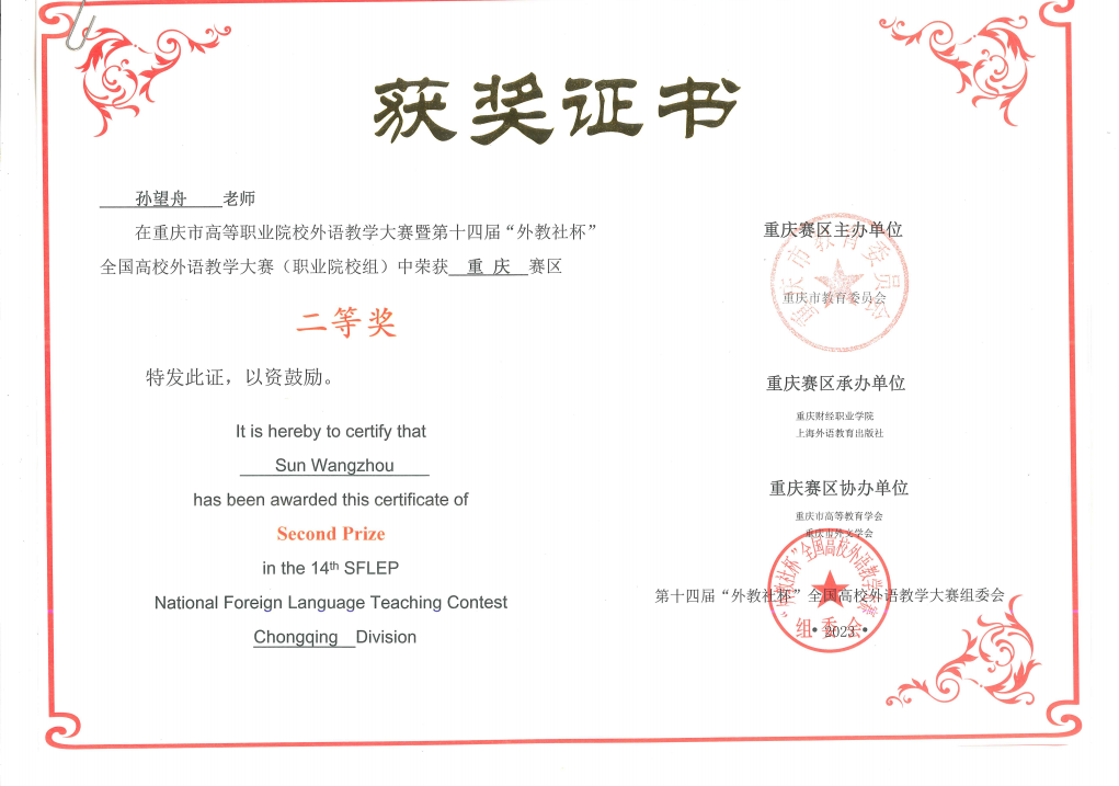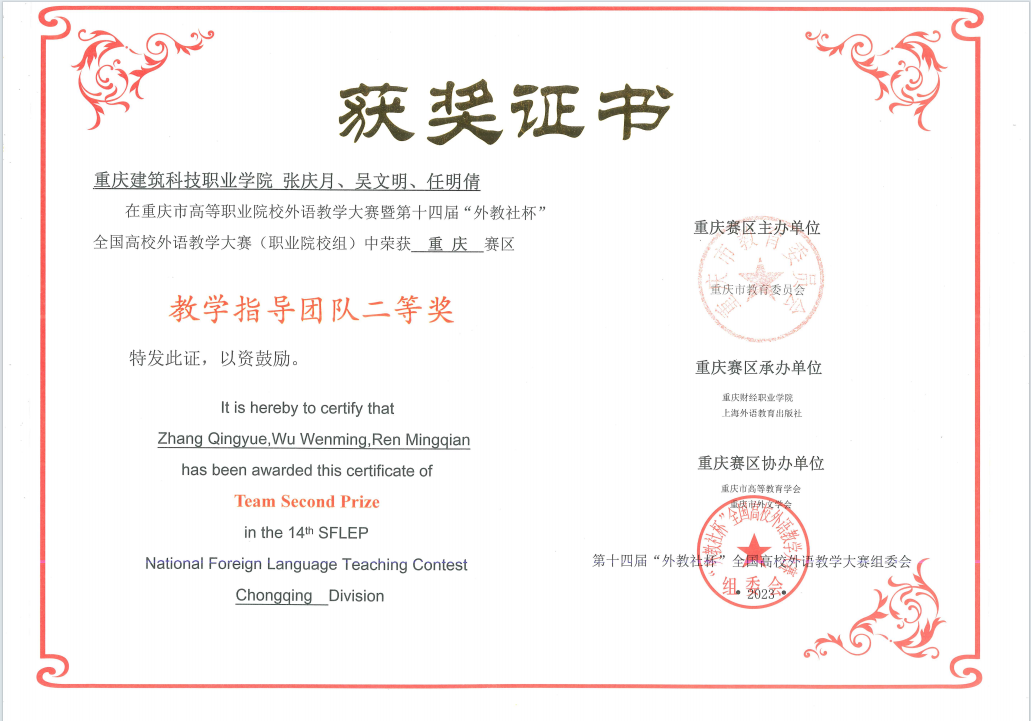 近日,第十四届“外教社杯”全国高校外语教学大赛(职业院校组)重庆赛区落下帷幕。经过与市内多所高校外语教师激烈角逐,beat365张庆月、吴文明、任明倩老师荣获教学指导团队二等奖,孙望舟老师荣获二等奖!