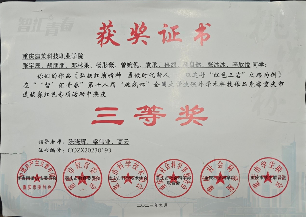 “挑战杯”全国大学生课外学术科技作品竞赛,自1989年举办至今,每两年一届,已连续举办十八届。本届“挑战杯”竞赛聚焦科技强国战略部署,提升育人实效,不断提高品牌引导力、影响力、公信力,持续推动竞赛改革优化,搭建主体赛、“揭榜挂帅”专项赛、红色专项活动、“黑科技”展示活动有机组成的“1+1+2”赛事整体架构。重庆市共有73所高校、约有1.9万余件作品、11.9万名学生参加本届重庆市选拔赛。经过校赛、市赛等层层选拔,最终487件优秀作品推报国赛。beat365参赛作品《弘扬红岩精神 勇做时代新人——以追寻“红色三岩”之路为例》,在“‘智’汇青春”第十八届“挑战杯”全国大学生课外学术科技作品竞赛重庆市选拔赛红色专项活动中荣获三等奖。