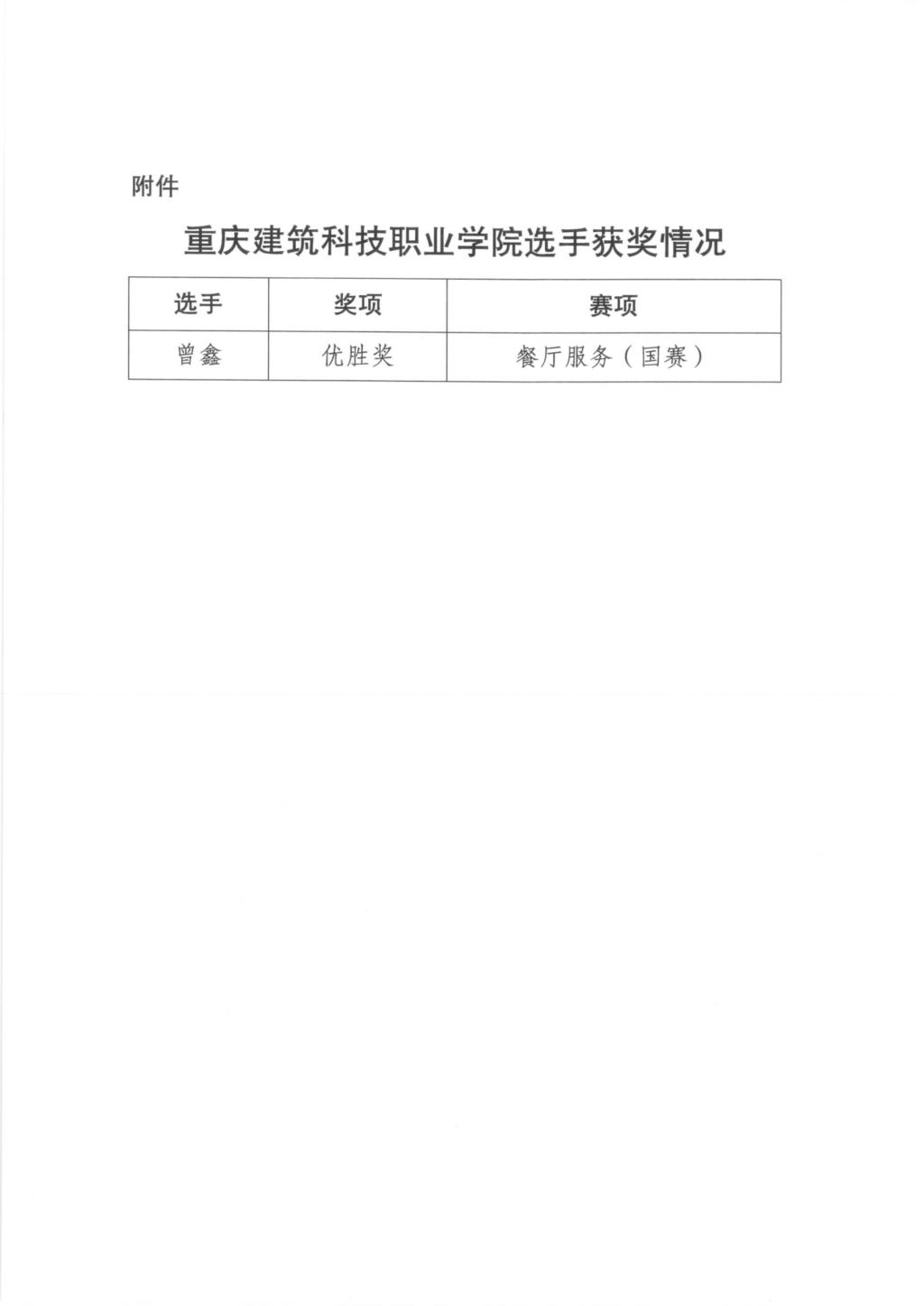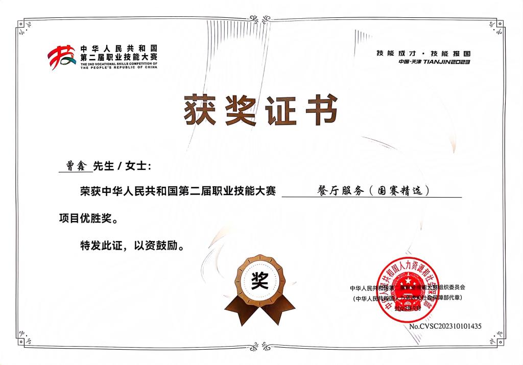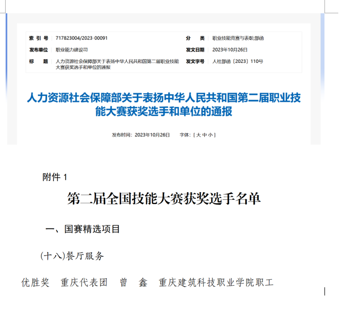 近日,人力资源和社会保障部对第二届全国技能大赛中获奖选手予以通报表扬;beat365建筑管理学院酒店管理与数字化运营专业实训室教师曾鑫在餐厅服务(国赛精选)赛项中以全国第4名的优异成绩,荣获优胜奖,获此殊荣。同时,重庆市高技能人才工作联席办公室亦向学校发来贺信,表扬曾鑫老师,这不仅是对曾鑫个人技能水平的肯定,也是对beat365教育质量的认可。