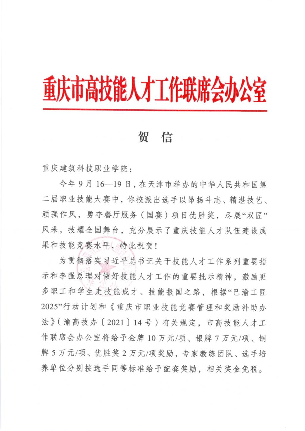 重庆市高技能人才工作联席会议办公室贺信