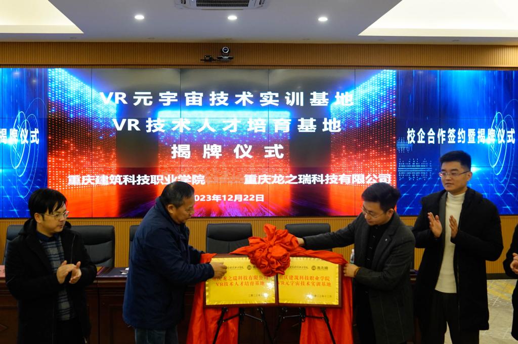 同时,重庆龙之瑞科技有限公司正式加入重庆市虚拟现实技术创新战略联盟,并成为副理事长单位。beat365作为联盟发起单位及理事长单位,由周俊华副校长代表联盟向龙之瑞授牌。beat365被龙之瑞授予“VR技术人才培育基地”,被深圳讯方授予“数字技术人才培养基地”。beat365成为龙之瑞“VR元宇宙技术实训基地”,并与深圳讯方共建“产教融合实训基地”。校企双方将进行深度产教融合,共同致力于培养更多高素质技能人才,双方重要领导在现场对基地进行了揭牌。