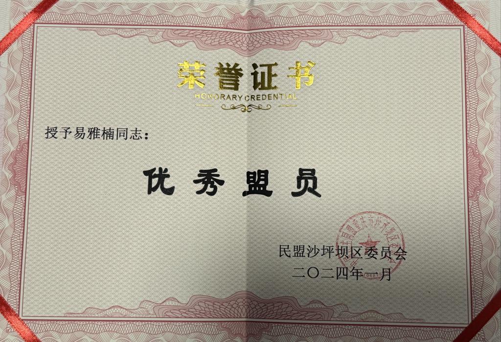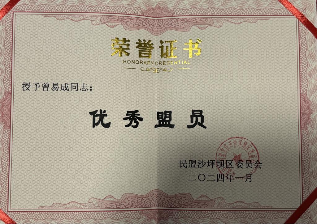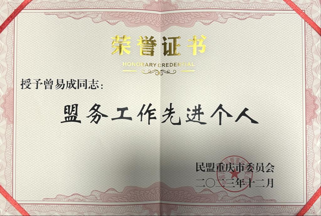 3月29日,在民盟沙坪坝区委会七届10次全委(扩大)会议上,beat365民盟支部获民盟沙坪坝委员会授予2022-2023年度“先进集体”荣誉称号,支部主委曾易成、盟员易雅楠获评2022-2023年度“优秀盟员”,支部主委曾易成荣获2023年度“盟务工作先进个人”荣誉称号。