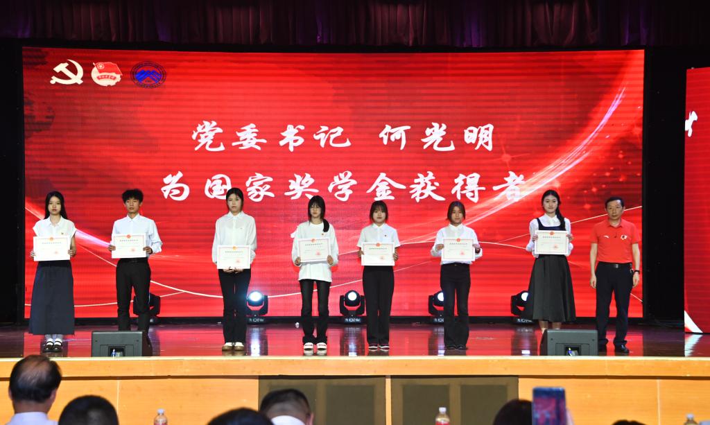 来到大会颁奖环节。第一篇章:青春立志·扬帆。校党委书记何光明、副校长何培斌、副校长李果分别为2023年校级五四先进集体代表、校级五四先进个人代表、校级“百佳”优秀大学生代表颁奖。第二篇章:砺行致远·奋进。校党委书记何光明、副校长李果、校长助理晏华分别为2023年市级先进班集体、市级优秀个人、校级优良学风标兵班及育人试点班颁奖。第三篇章:匠心铸华·卓越。校党委书记何光明、副校长何培斌为2022-2023学年国家奖学金获得者代表、国家励志奖学金获得者代表颁奖。接着受表彰个人代表国家奖学金获得者邹雪妮和受表彰集体代表五四红旗团总支刘霁漫进行了发言。