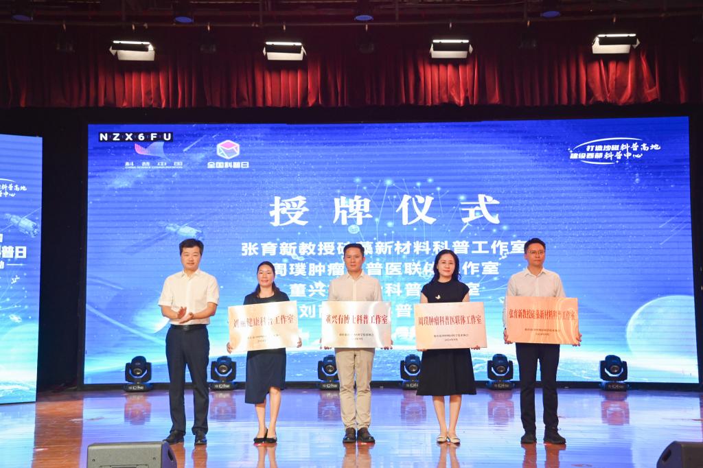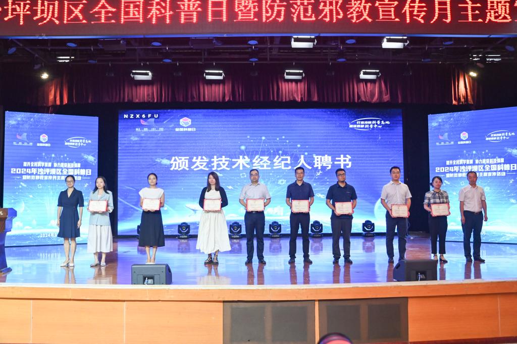 沙坪坝区政府副区长凌健为4家新成立的专家科普工作室授牌,沙坪坝区科协主席马骁、沙坪坝区科技局党组成员、副局长韩文莉为8位区技术经纪人代表颁发聘书。