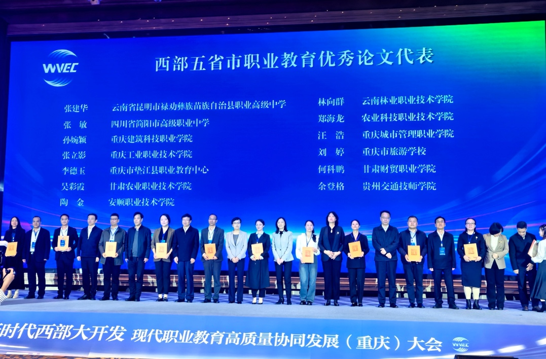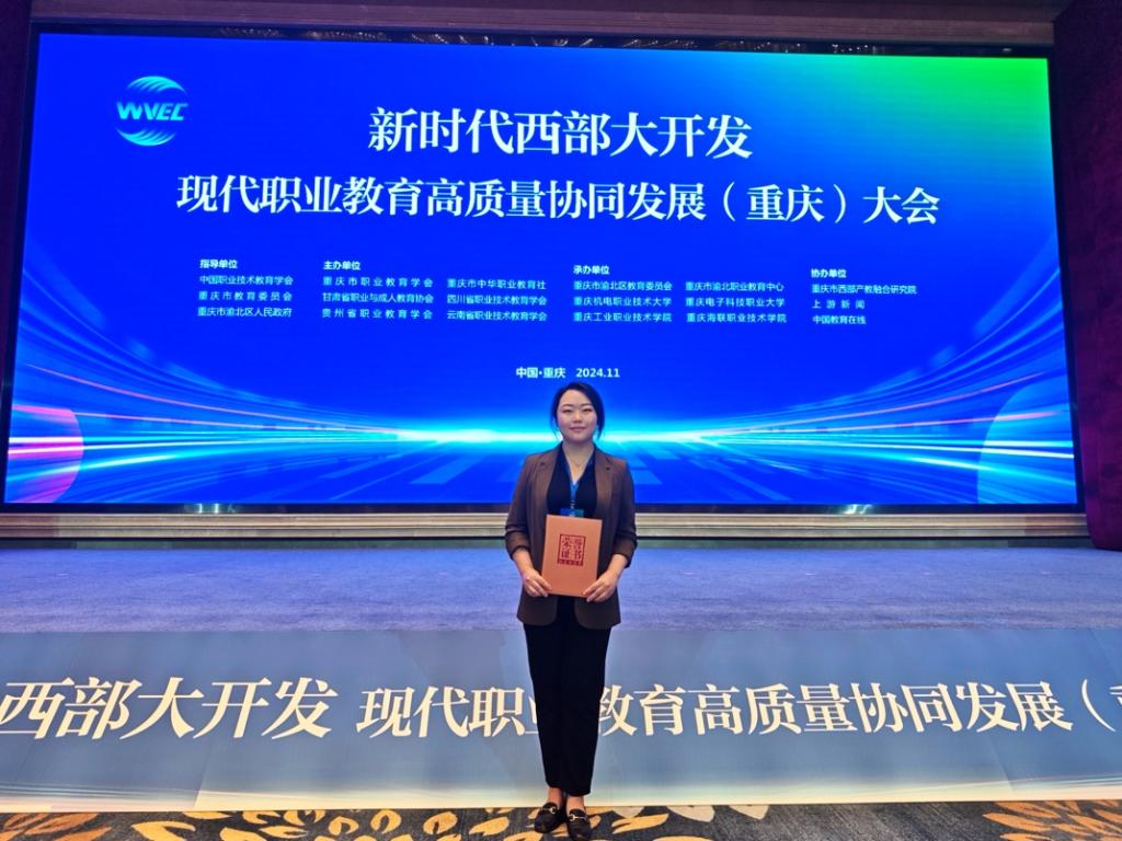 大会上,西北五省市职业教学学会联合对“新时代西部大开发——现代职业教育高质量协同发展优秀论文”和“新时代西部大开发——现代职教之星”部分优秀代表进行表彰。beat365学生李慧琳在“现代职教之星”遴选中斩获“技术技能之星”称号,beat365教师孙婉颖在“优秀论文征集”中斩获一等奖,并选为重庆市代表接受表彰。