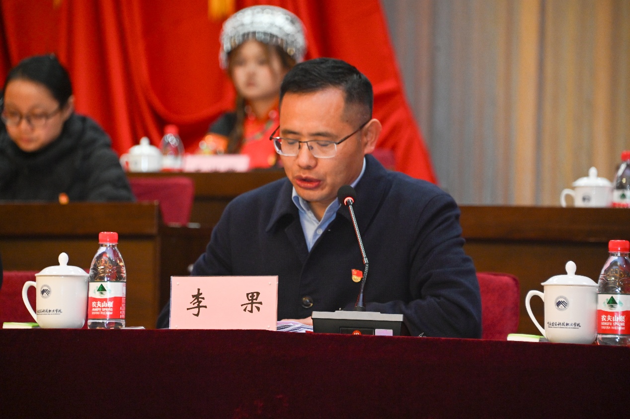 校长助理、工会主席晏华致辞,指出共青团和工会作为党领导的群团组织,在团结和引领群众、服务学校发展中肩负重要职责。重庆财经学院团委书记夏文瑞向大会的顺利召开表示热烈祝贺。沙坪坝区团委副书记李力则充分肯定了学校共青团近年来取得的突出成绩,并表达了对未来加强校地合作、共促共青团事业发展的美好期望。共青团重庆市委副书记杨春渝发表讲话,她充分肯定了学校共青团近年来的突出成效,并提出四点期望:一是切实加强青年师生的政治引领,深入推进用习近平新时代中国特色社会主义思想凝心铸魂,强化团组织与思政课的有机融合,教育青年坚定信念;二是广泛动员青年服务国家和区域发展战略,实施“青年实干家建设新重庆计划”,组织青年积极投身社会实践与公益服务;三是更好地联系和服务青年,通过“我为青年办实事”等活动解决师生实际问题,增强获得感与幸福感;四是对标全面从严治党推进从严治团,推动“红岩先锋”变革型团组织建设,进一步规范团组织管理和团员发展。杨春渝副书记的讲话为学校共青团工作提供了方向指引,进一步激发了青年团员的奋斗热情。开幕式最后,校党委副书记、副校长李果同志发表讲话。他提出,学校正处在全面推进中国一流职业大学奋斗目标建设的关键节点,全校各级团组织一定要高举习近平新时代中国特色社会主义思想伟大旗帜,凝心聚力、奋发进取,引领广大青年坚定理想信念,做自觉自信的建院青年,讲话表达了对青年团员的殷切期望与鼓励。