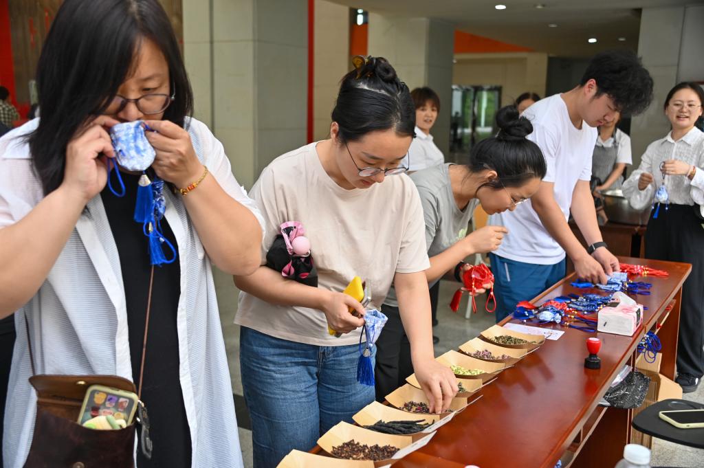 活动现场分为竞技比赛、文化体验和游戏挑战三大区域。竞技区“同舟共济”“气贯长虹”等团队游戏点燃了师生们的热情;文化体验区提供包粽子、制香囊等传统项目,参与者亲手制作节日礼物;游戏挑战区“粽钓江湖”“五毒退散”等创意游戏更是欢声笑语不断。动漫社、茶艺社等学生社团也积极参与,为活动增添了青春活力。