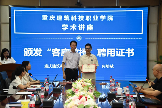 讲座特邀岩土工程专家、原中贝天丰工程技术有限公司董事长倪良位高级工程师主讲。倪良位同志深耕行业30余年,参编《建筑地基基础检测技术规范》等多部地方标准,具备深厚理论与实践积淀。何培斌副校长为倪良位高级工程师颁发“客座教授”聘书,讲座由学校智能建造学院院长彭丽莉主持。