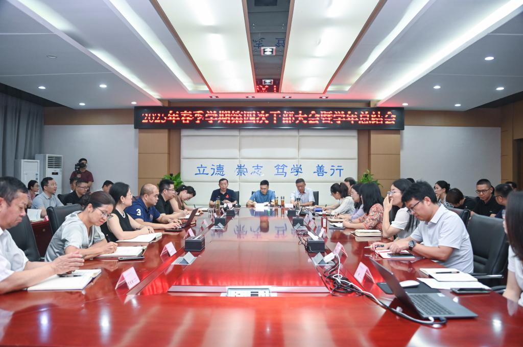 2025年7月10日上午,学校在立德楼六楼会议室召开2025年春季学期第四次干部大会暨2024-2025学年总结会。本次会议以“总结过往经验、凝聚发展共识、谋划未来蓝图”为主题,系统回顾学年工作成效,科学展望下一阶段发展方向,为推动学校高质量发展筑牢根基。学校执行理事长文厚润、校长张进、党委书记何光明,全体科级及以上干部参加会议。
