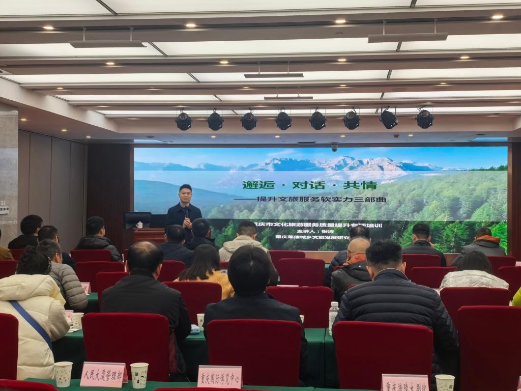 2025年12月1日,学校智慧康养学院技能大师张涛教授为重庆市文化旅游委、各区县文化旅游委分管负责人,科室负责人以及市文旅行业协会和相关企业负责人开展了一场主题为“邂逅、对话、共情”的文旅行业服务质量提升专题培训。