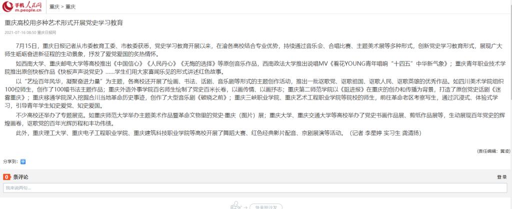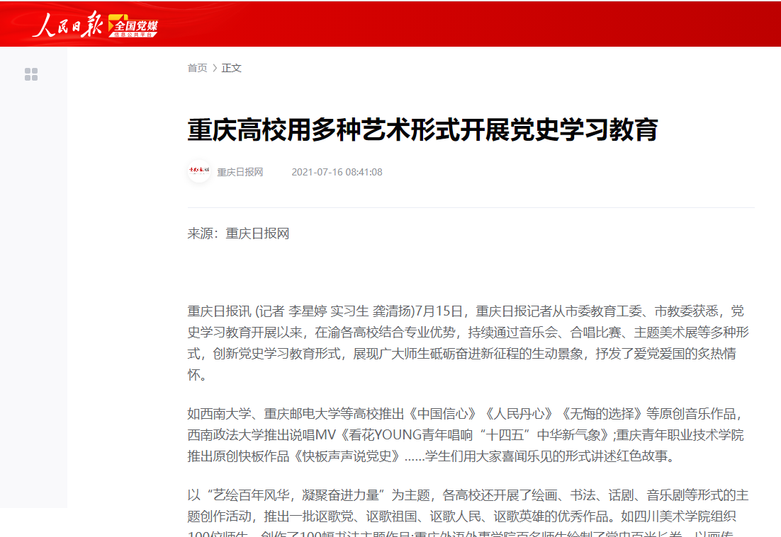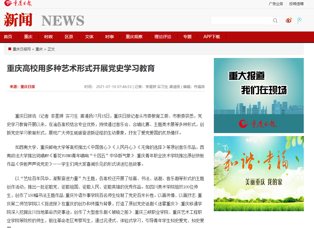 人民日报、重庆日报、搜狐新闻、国际在线等媒体报道beat365用多种艺术形式开展党史学习教育