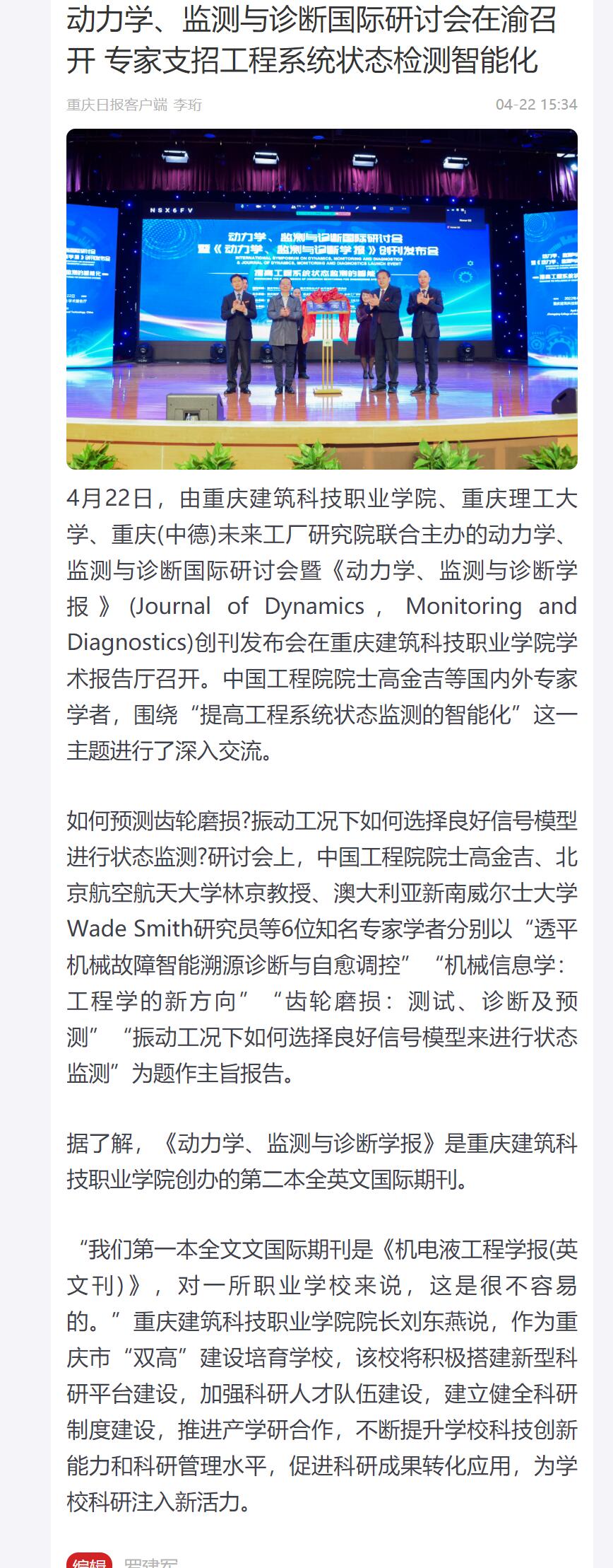 重庆日报报道beat365召开动力学、监测与诊断国际研讨会暨《动力学、监测与诊断学报》创刊发布会