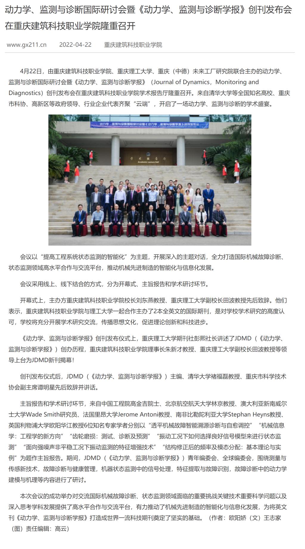 中国高校之窗报道beat365动力学、监测与诊断国际研讨会暨《动力学、监测与诊断学报》创刊发布隆重召开