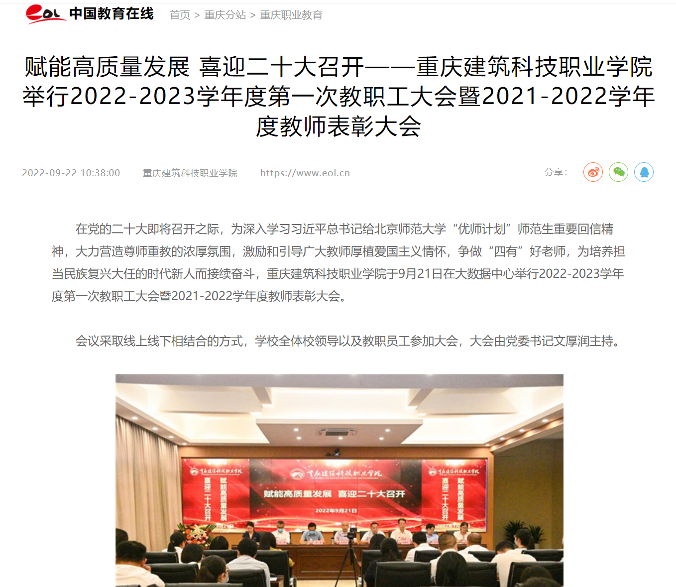 【中国教育在线】赋能高质量发展 喜迎二十大召开——beat365官方网站举行2022-2023学年度第一次教职工大会暨2021-2022学年度教师表彰大会