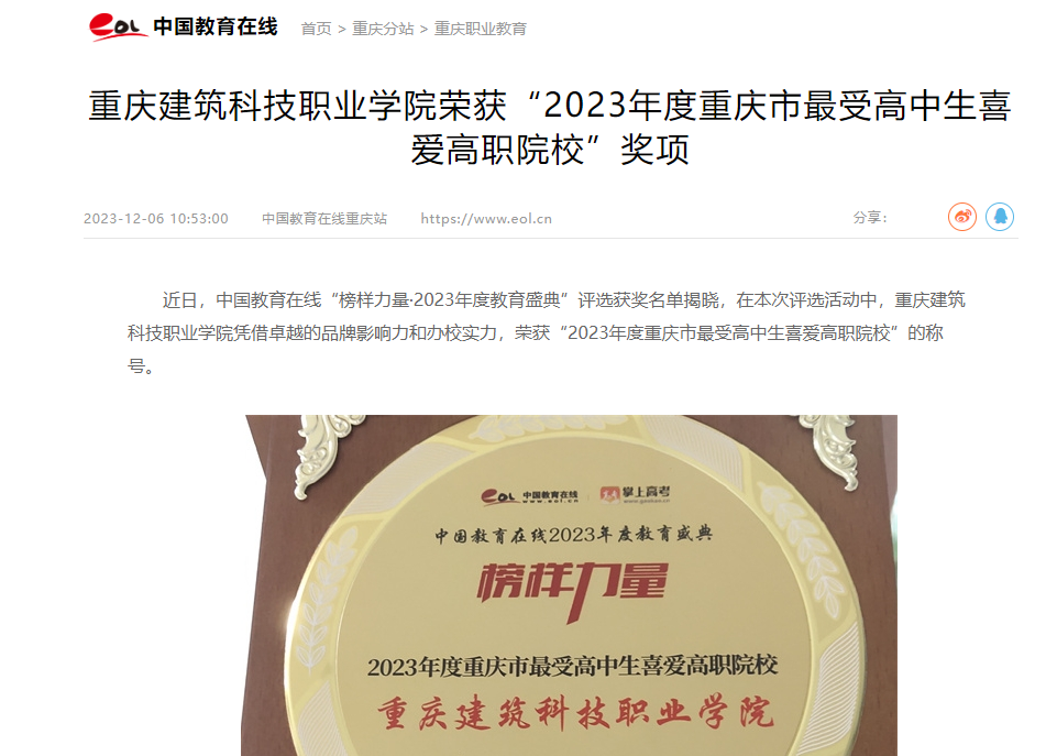 【中国教育在线】beat365官方网站荣获“2023年度重庆市最受高中生喜爱高职院校”奖项