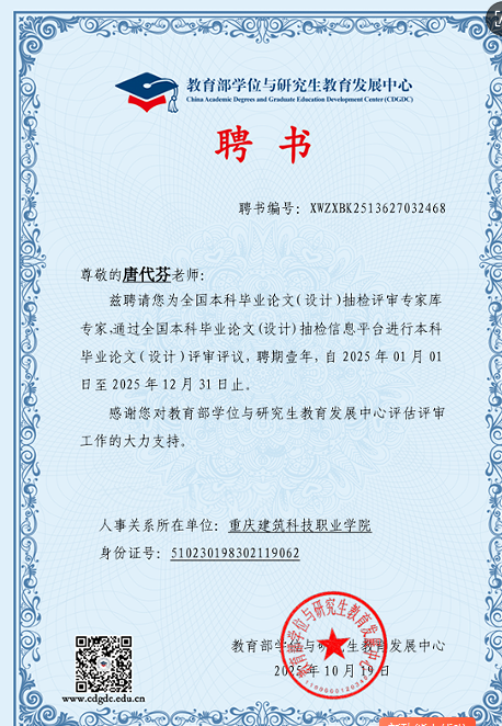 2025年10月,重庆建造科技职业学院通识教育学院唐代芬老师入选“全国本科毕业论文(设计)抽检评审专家库”,并获聘担任评审专家。