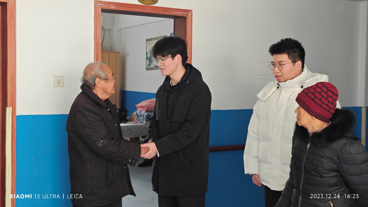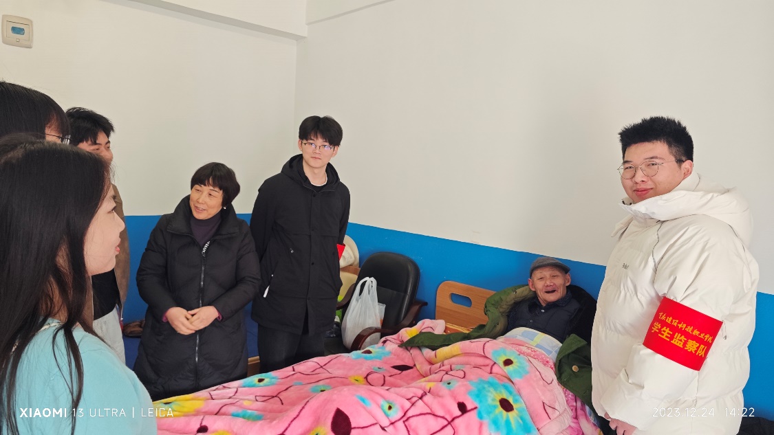 2023年12月24日下午,在辞旧迎新之际,学校纪检监察室张意老师、基础教学部陈晓辉老师带领第八届学生监察队学生代表,赴重庆高新区香炉山街道敬老院开展了献爱心慰问活动,老师和同学们与敬老院的爷爷、奶奶们亲切交谈,为爷爷、奶奶送去温暖和关爱。