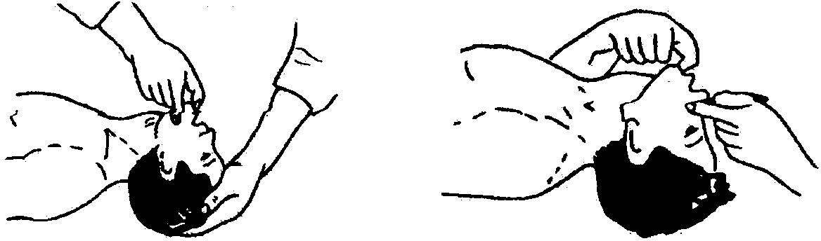 图 2-5 身体仰卧,头部后仰 图 2-6 捏鼻掰嘴准备进行